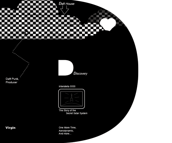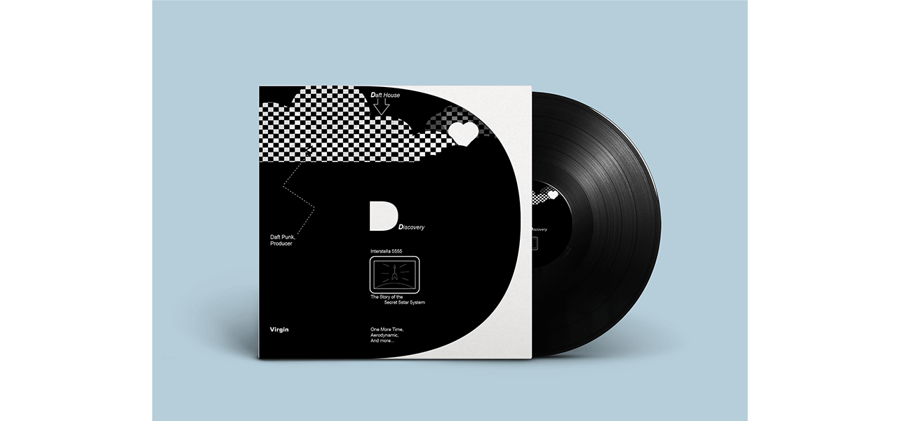 Hypothetical cover for Daft Punk's Discovery album that incorporates design elements from Dan Friedman and the Postmodern era.